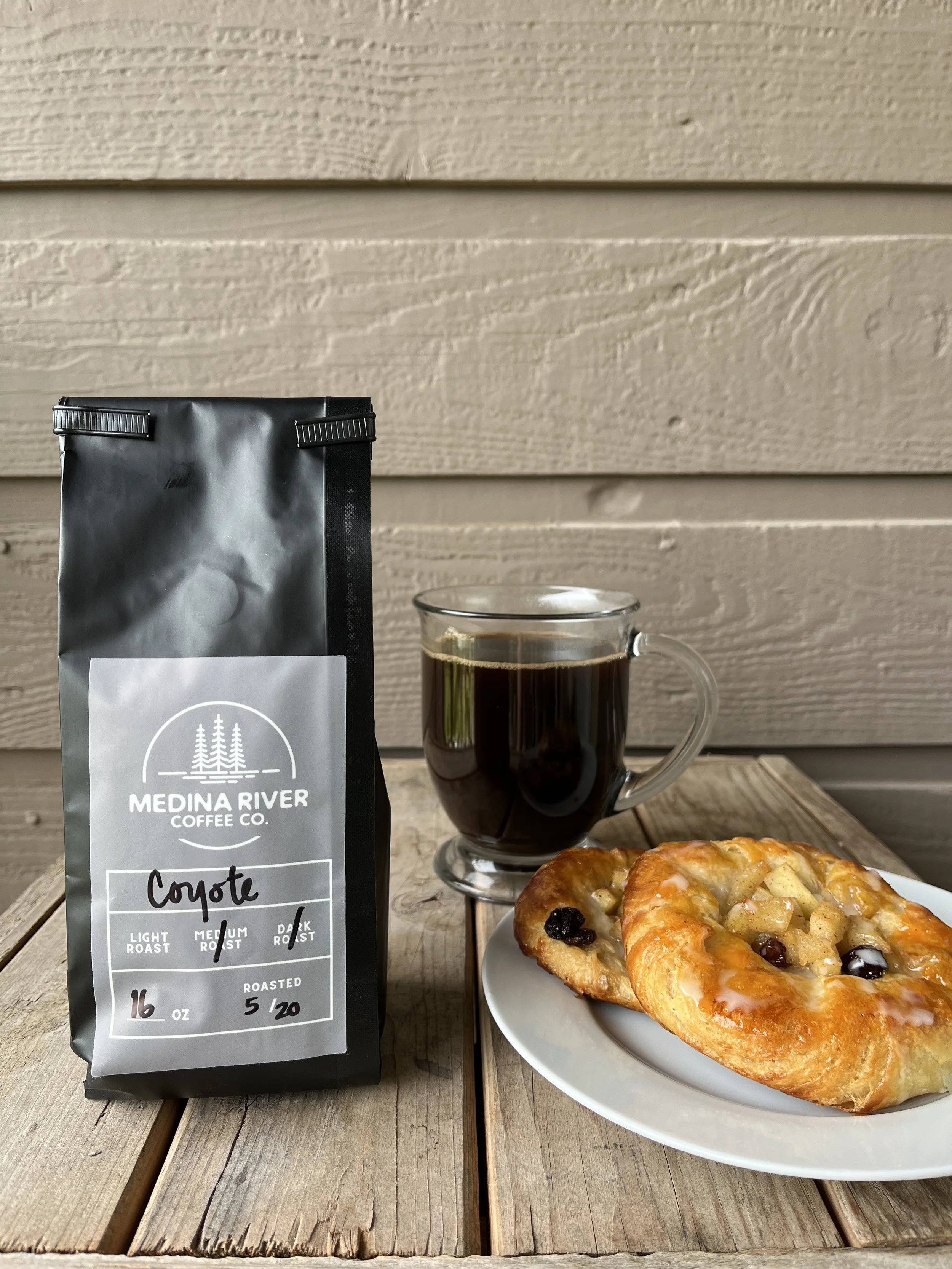 On our last visit we picked up a bag of Medina River Coffee’s Coyote Blend. This whole bean is a dark roast with a slightly oily exterior and what Medina serves when you order a luxurious drip coffee.